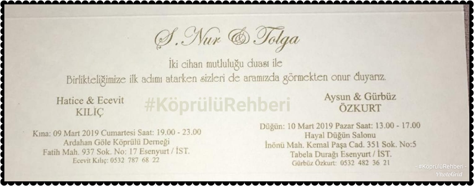Gürbüz&Aysun ÖZKURT’ın oğlu Tolga ile, Hatice& Ecevit KILIÇ’ın kızları Ş.Nur KILIÇ’ın evlilik töreninde siz değerli dostları aramızdan görmekden onur duyarız.
